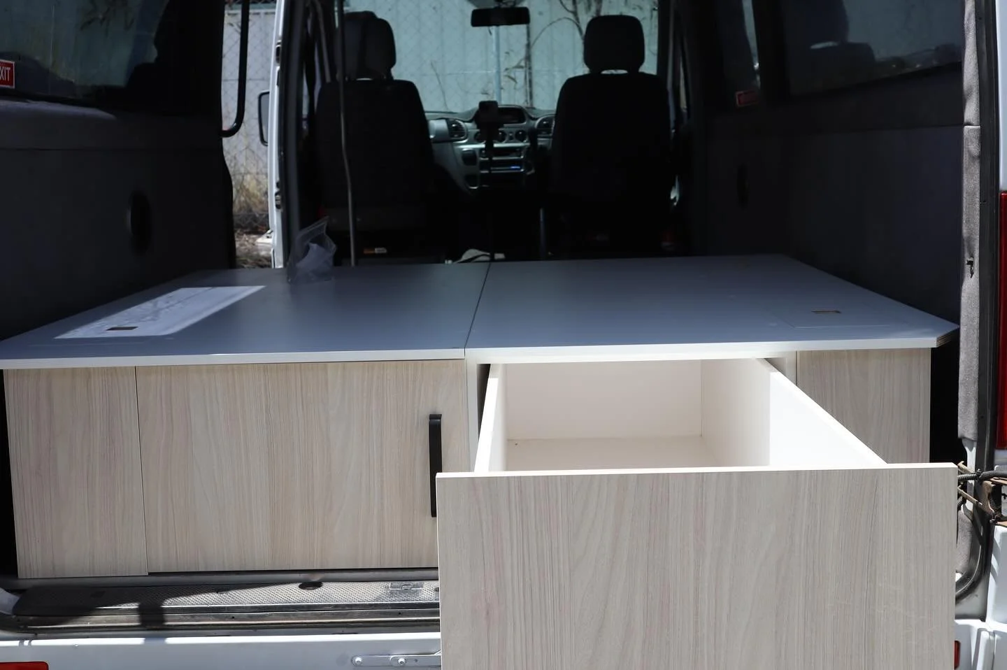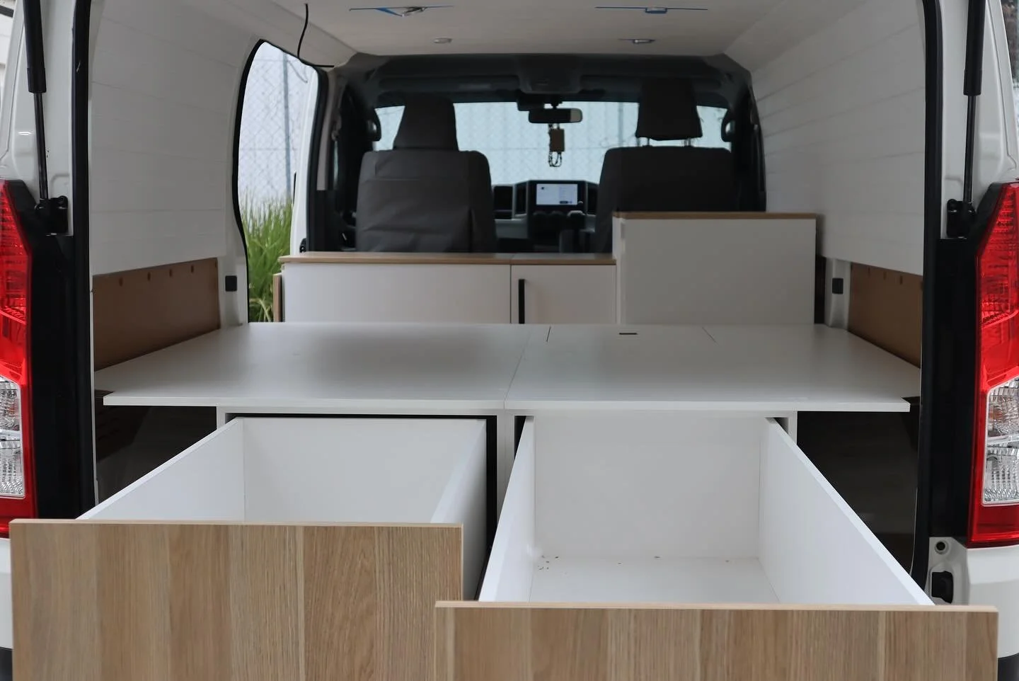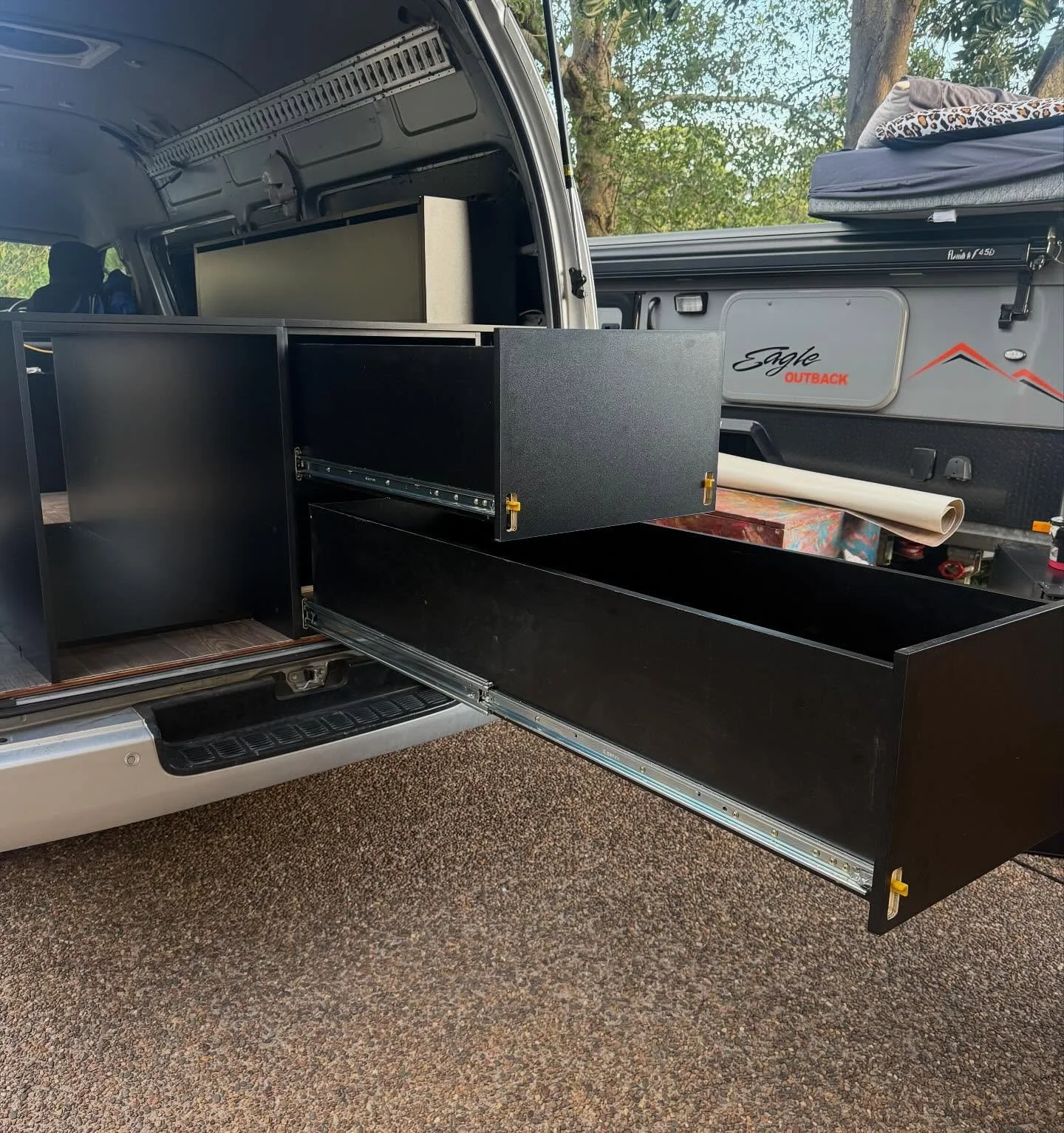 Experience your next journey with confidence and realise your dream van life. Convert your vans into a livable space with functional features and loads of storage, such as a bed, kitchen, storage drawers, access panels, toilet storage, and space for electrical and water systems.